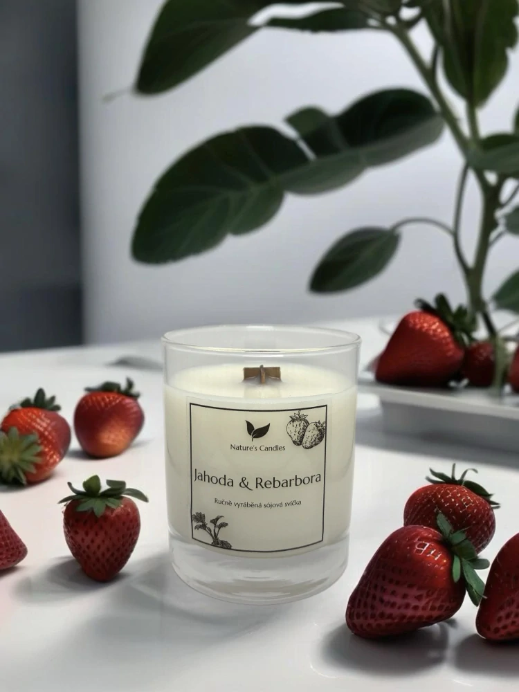Sójová svíčka s vůní Jahody & Rebarbora, dokonalá ovocná vůně, ne příliš sladká ani kyselá, kombinace čerstvě natrhaných jahod a růžové rebarbory.