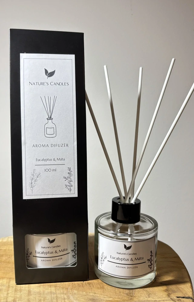 Aroma difuzér s vůní Eucalyptu & Máty, sladká a silná vůně máty smíchaná s natrhanými listy eucalyptu. Vůně má vysoký obsah esenciálních olejů.