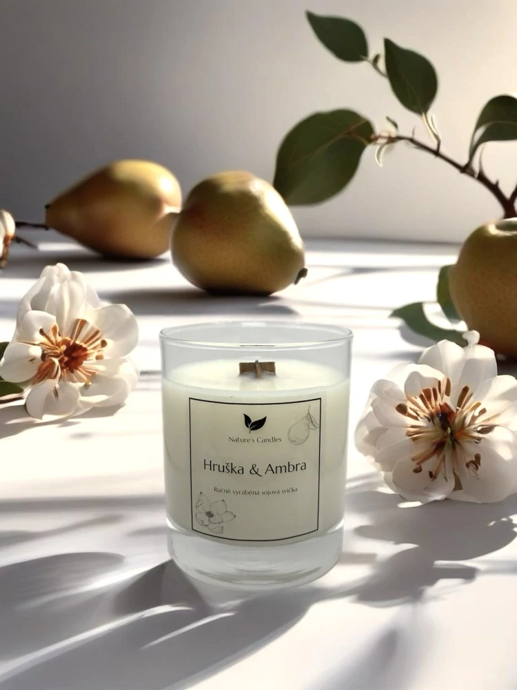 Sójová svíčka s vůní Hrušky & Ambry, vůně se svěžími vrchními tóny bergamotu, citronu a hrušky. Jemné tóny magnólie, orchideje, růže vytvářejí jemné srdce, následované základem pižma, suché ambry a nádechem pačuli.