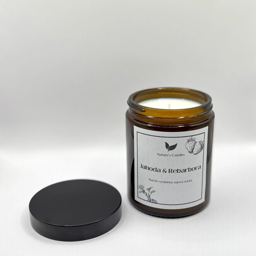 Sójová svíčka s vůní Jahody & Rebarbora, dokonalá ovocná vůně, ne příliš sladká ani kyselá, kombinace čerstvě natrhaných jahod a růžové rebarbory.