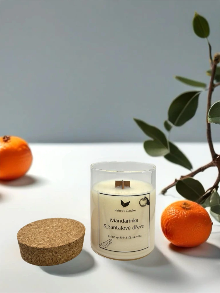 Sójová svíčka s vůni Mandarinek & Santalového dřeva, která má jemné tóny čokolády, mandarinek, dřevitých a citrusových vůní s vanilkovým základem.