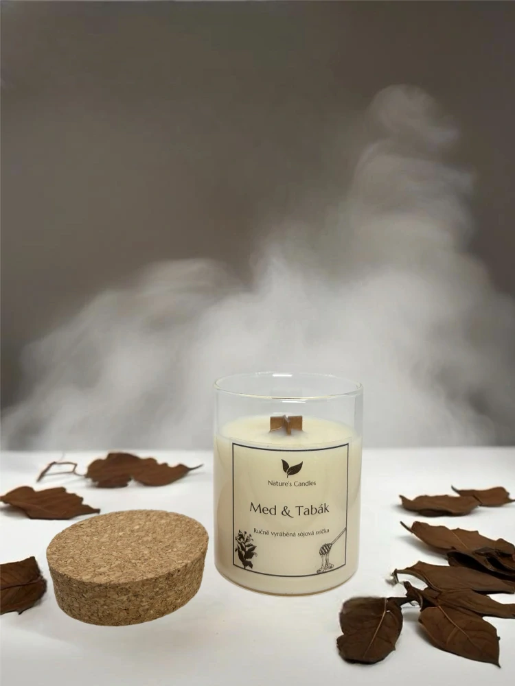 Sójová svíčka s vůni Medu & Tabákových listů, tmavá a silná směs tabákových listů, zjemněná medovými akordy.