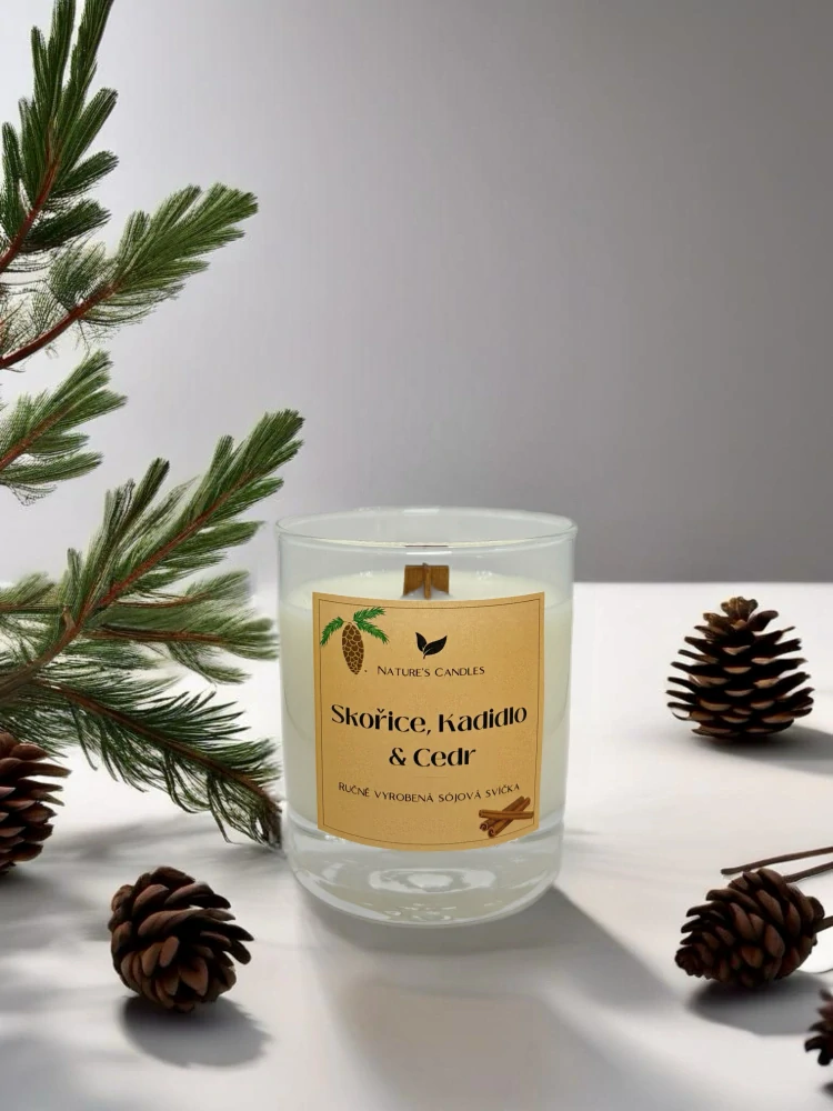 Sójová svíčka s vůní Skořice, Kadidla a Cedru, komplexní směs skořice, hřebíčku a myrhy je obohacena o intenzivní tóny cedrového dřeva, ambry a kadidla.