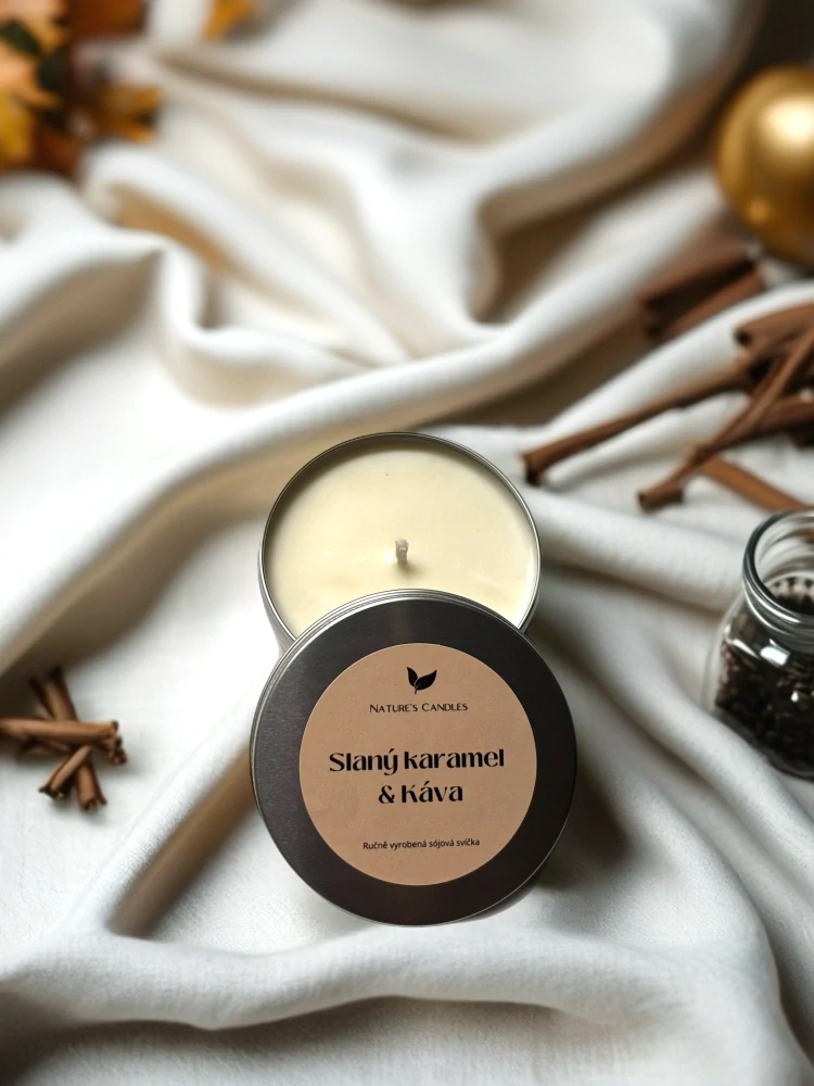 Sójová svíčka s vůní Slaného karamelu & Kávy, příjemná vůně slaného karamelu s lehkými tóny kávových zrnek, která vás okouzlí.