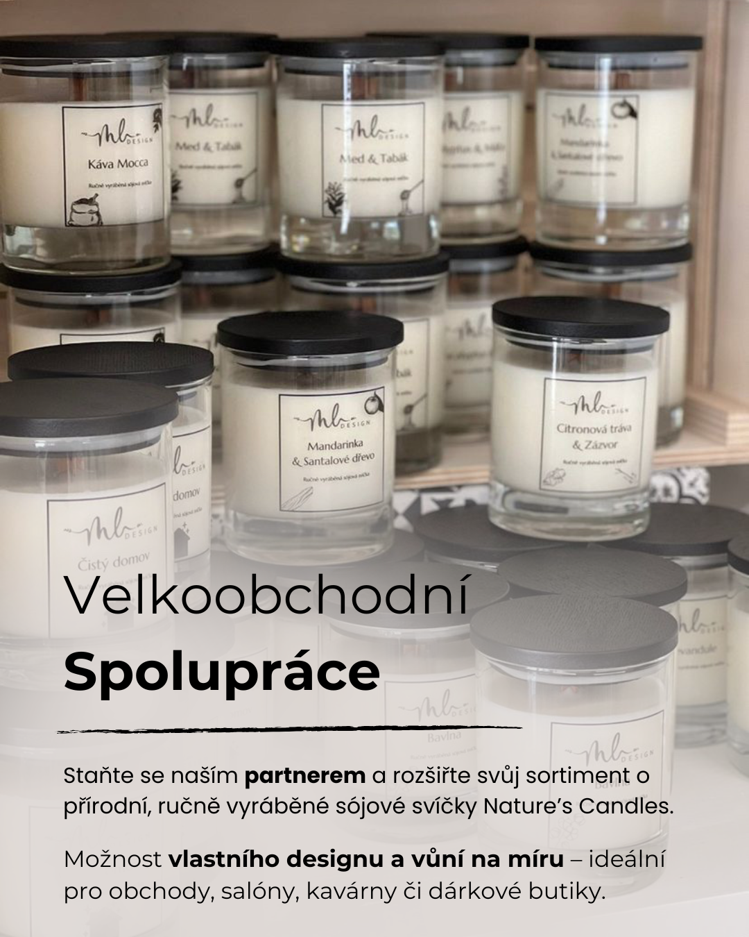 Nabízíme velkoobchodní spolupráci pro obchody, e-shopy, květinářství, designové prodejny nebo kavárny, které chtějí svým zákazníkům nabídnout přírodní sójové svíčky a bytové vůně vyráběné ručně v České republice. 🇨🇿